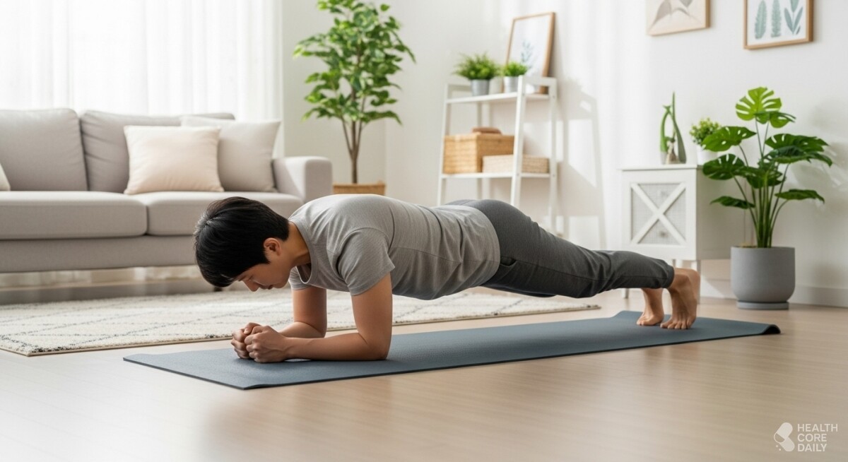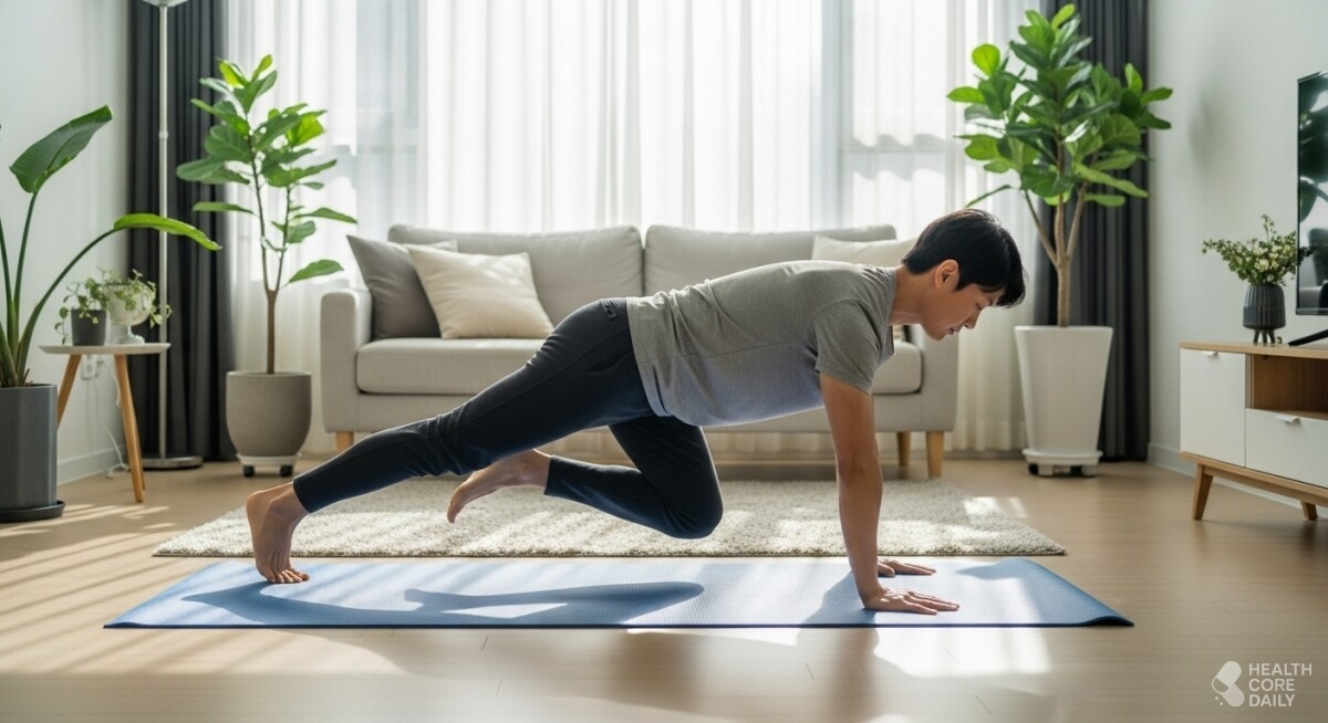 하프 버피는 기본 버피 동작에서 점프를 뺀 형태로, ‘서 있다가 쪼그려 앉은 뒤 다리를 뒤로 뻗어 플랭크 자세를 만들고, 다시 앞으로 가져와 일어서는’ 과정을 반복하는 전신 운동이다. 점프가 없기 때문에 관절 부담과 소음이 적어, 아파트나 층간 소음이 걱정되는 환경에서도 무리 없이 할 수 있다.