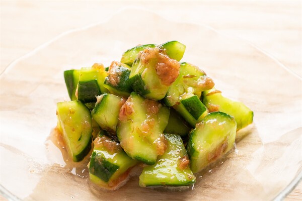 사과식초 오이무침: 오이 1개, 사과식초 1큰술, 소금 약간, 참기름 몇 방울
