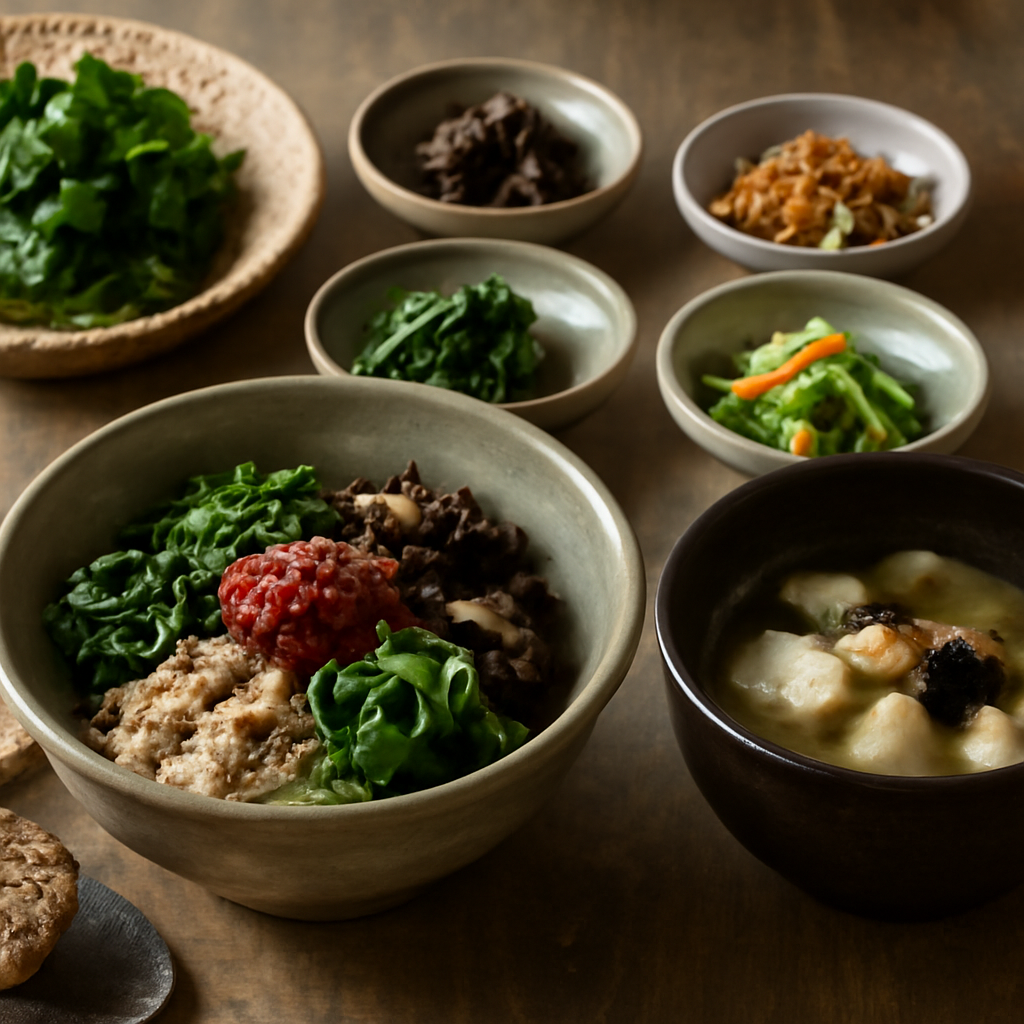 가장 쉬운 건 나물 무침이에요. 시금치, 도라지, 고사리 같은 나물을 살짝 데쳐서 참기름, 깨소금, 소금만으로 간을 맞추면 돼요. 마늘 대신 생강 우린 물을 조금 넣으면 더 깊은 맛이 나더라고요!
