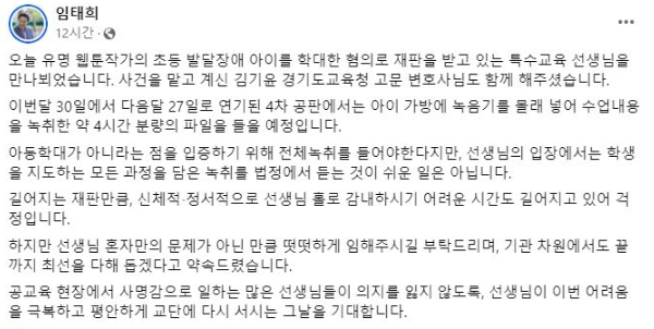 경기도 교육감 임태희는 최근 웹툰 작가 출신 유튜버인 주호민과의 만남에 대해 SNS를 통해 직접 공개했다. 그는 특수 교육 선생님을 변호하는 변호사와 함께 만난 사실을 알렸으며, 이로 인해 재판 일정이 변경되었다고 밝혔다.
