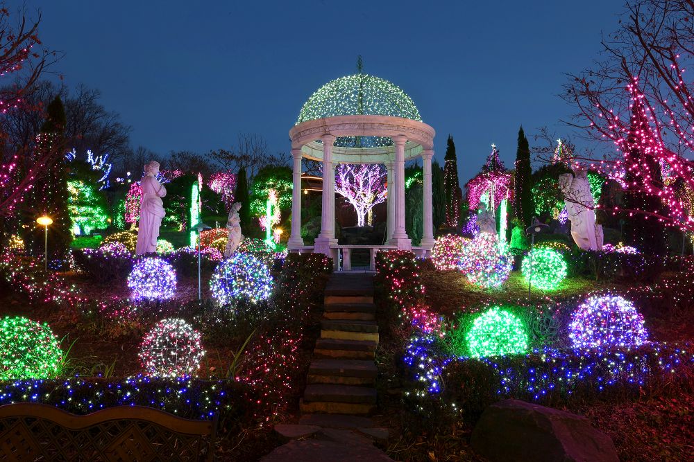정원 중앙의 제우스 벽천분수와 로마식 회랑 구조는 그리스 로마 신화 속 신전, 혹은 고대 신들의 정원을 재현한 듯한 분위기를 만들어 줍니다. 겨울엔 화려한 조명이 정원 곳곳을 더 화려하고 신성하게 만들어 주는데요.