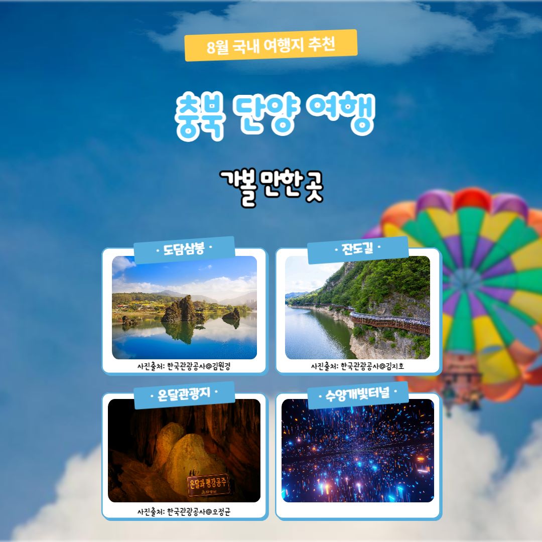단양은 강, 산, 동굴 등 다양한 지형이 조화롭게 어우러진 지역입니다. 자연 그대로의 상쾌함을 느끼며 유유자적한 여행을 할 수 있습니다.