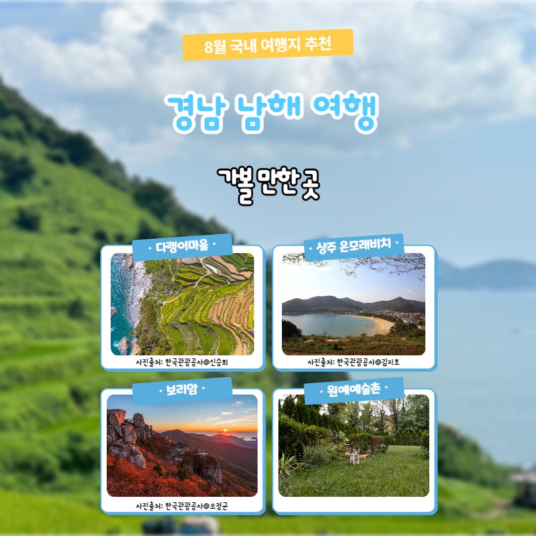 남해는 해안 드라이브와 감성, 논밭 풍경이 예술입니다. 산책과 힐링, 소소함을 즐기고 싶은 분들께 추천드리는 8월 국내 여행지 추천 지역입니다.