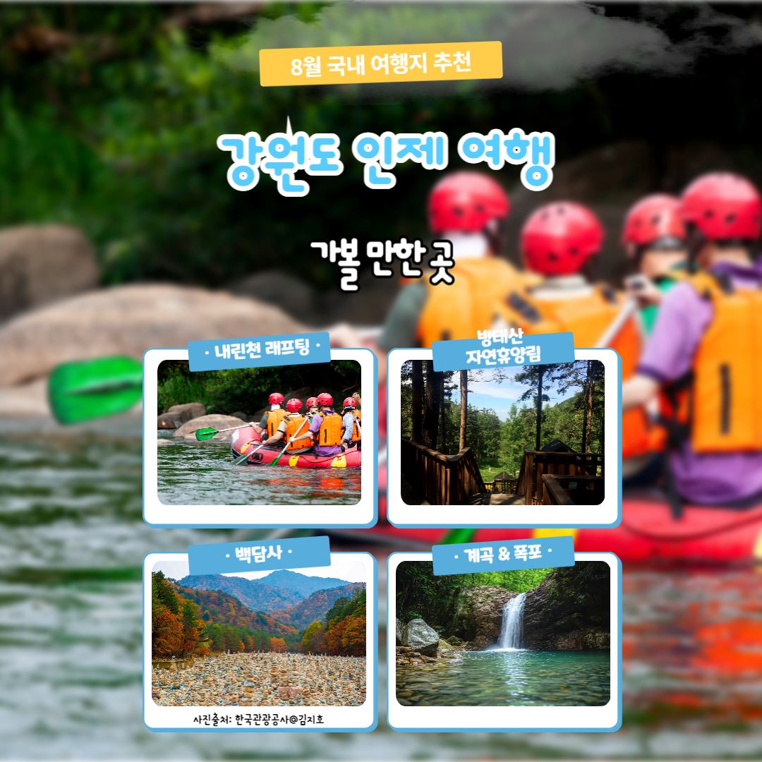 강원도 인제는 폭염을 피하기 안성맞춤인 자연 휴양지입니다. 시원한 계곡과 숲, 폭포, 산 그리고 고즈넉한 사찰까지 즐길 수 있습니다.