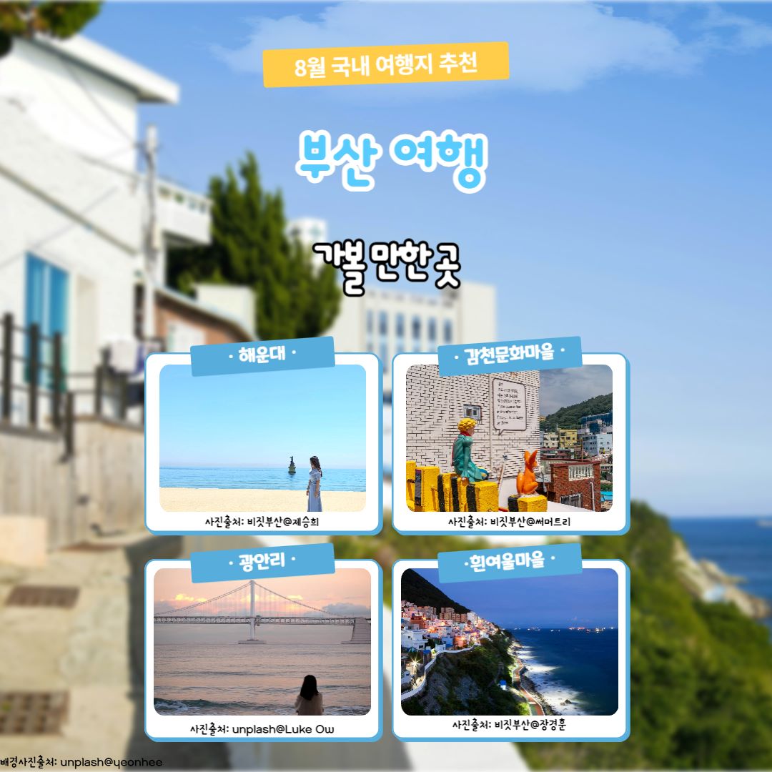 부산은 여름 바다와 감성이 흘러 넘치는 제2의 도시입니다. 피서, 산책, 미식, 문화체험, 즐길 거리, 쇼핑 등 뭐 하나 빠지는 게 없을 정도로, 8월 국내 여행지 추천에 부족함이 없습니다.