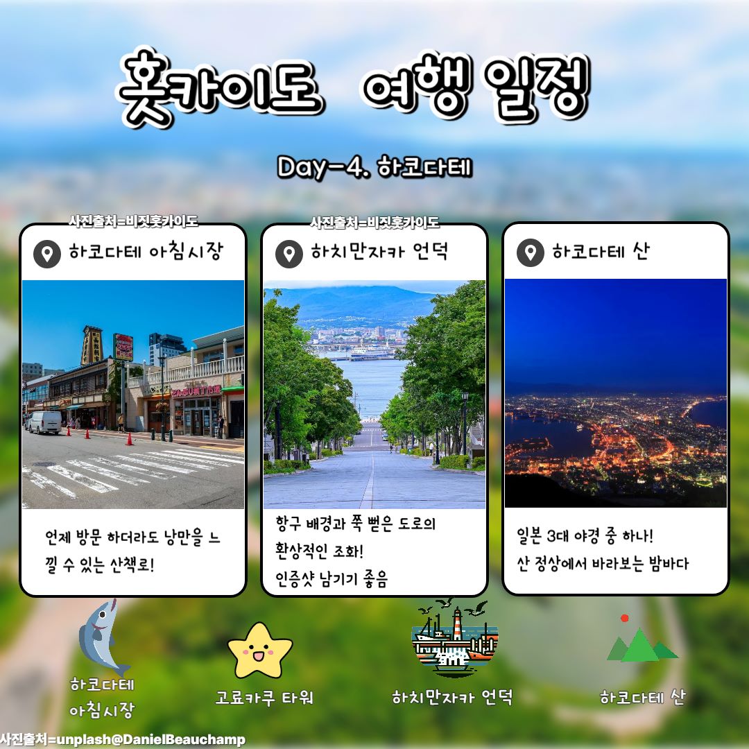 홋카이도 남부의 하코다테는 일본 3대 야경으로 손꼽히는 하코다테 산의 환상적인 야경과 이국적인 건축물이 가득한 모토마치 거리로 유명한데요. 신선한 해산물과 활기 넘치는 아침시장, 그리고 바다와 도시가 어우러진 풍경까지, 홋카이도 여름 여행 코스의 마지막을 장식하기에 너무나 낭만적입니다.