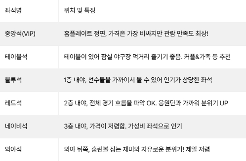 → 1루 측 레드석 또는 네이비석 307·308번 블럭 추천 (응원단과 가까움)
