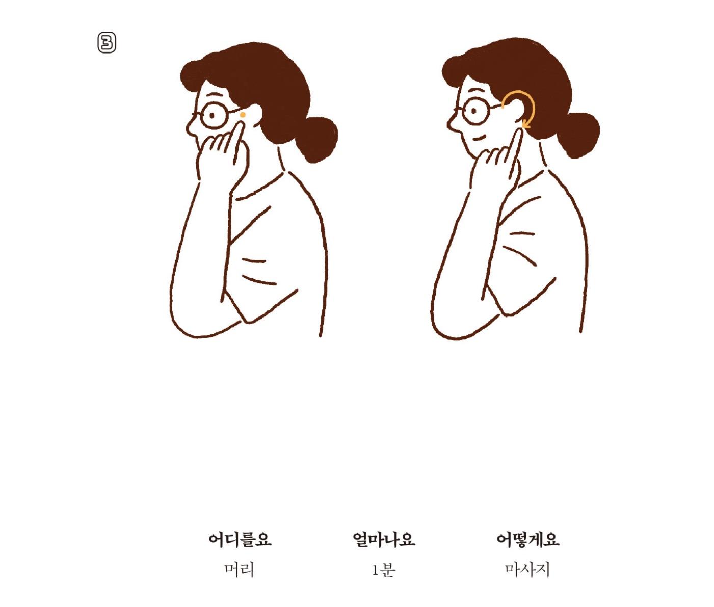 이때 관자놀이부터 정수리까지 검지로 원을 그리며 마사지하고 뒤통수 쪽도 골고루 마사지해 주면 도움이 된다. 검지로 귀 모양을 따라 귀 앞 오목한 곳부터 귓불 뒤까지 ‘C’모양을 그리며 마사지해 준다. 약으로 의지했던 두통. 이제 머리가 지끈거릴 때는 혈액순환을 돕는 간단한 림프 마사지로 풀어보자.