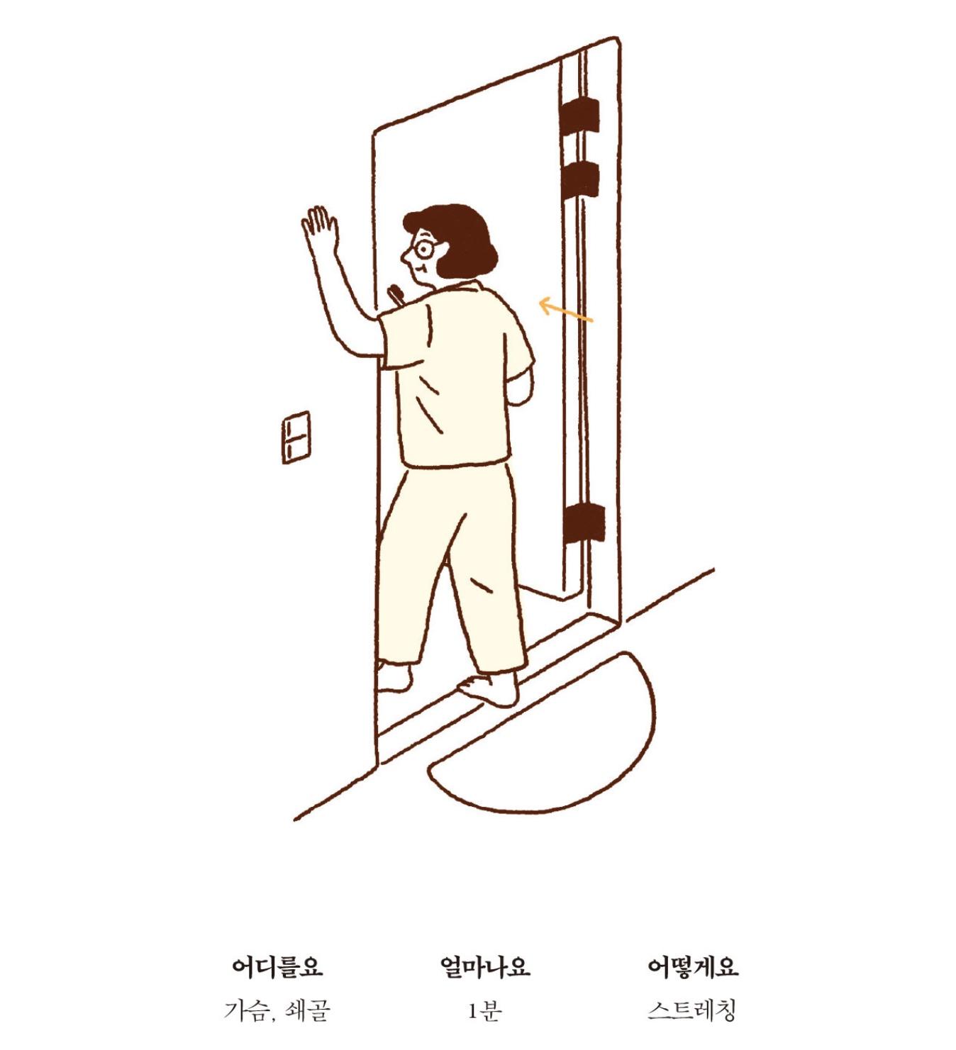 양치질을 하는 반대쪽 손바닥부터 팔꿈치를 문틀 위에 올린다. 팔꿈치와 어깨가 나란히 놓이게 하자. 올린 팔과 같은 쪽 발을 한 발 앞으로 내디디면 왼쪽 어깨와 윗가슴 근육이 늘어나는 것을 느낄 수 있다. 핸드폰, 운전, 컴퓨터 등으로 말린 어깨 근육을 풀어주는 동작이다.