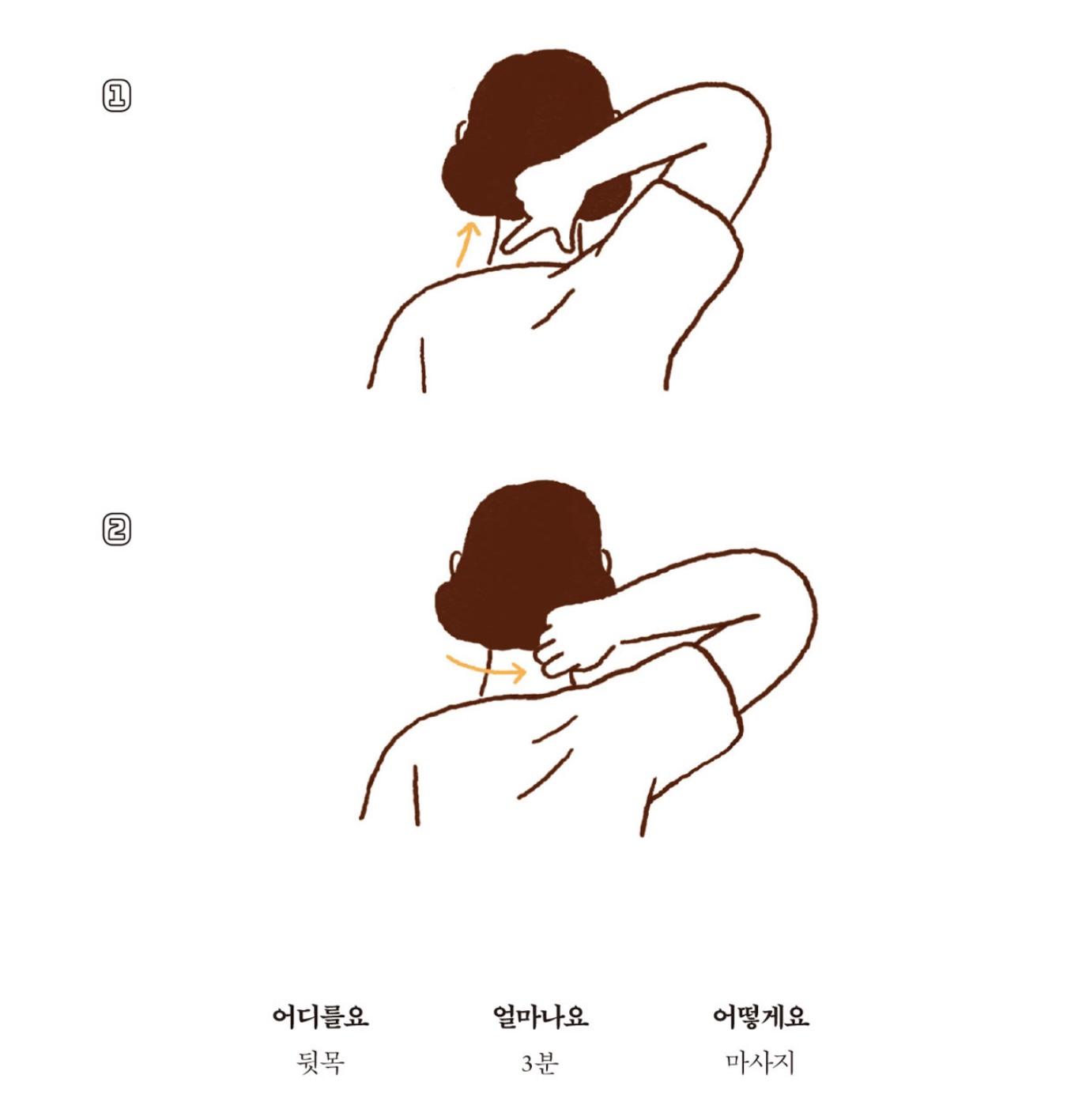 오른손 엄지로 목덜미 오른쪽 위에 두고 검지로 뒷목 왼쪽에 올린다. 목 아래부터 위로 올라가며 꾹꾹 눌러주다가 머리와 목이 연결되는, 움푹 파인 곳을 오래 마사지해 주자. 그다음에는 꿀밤을 때리는 듯한 자세로 엄지와 검지 관절로 뒤쪽 헤어라인을 따라 작은 원을 그리듯 마사지해 준다. 혈액순환이 되면서 산소 공급이 원활해져 열이 오르는 것을 막을 수 있다.