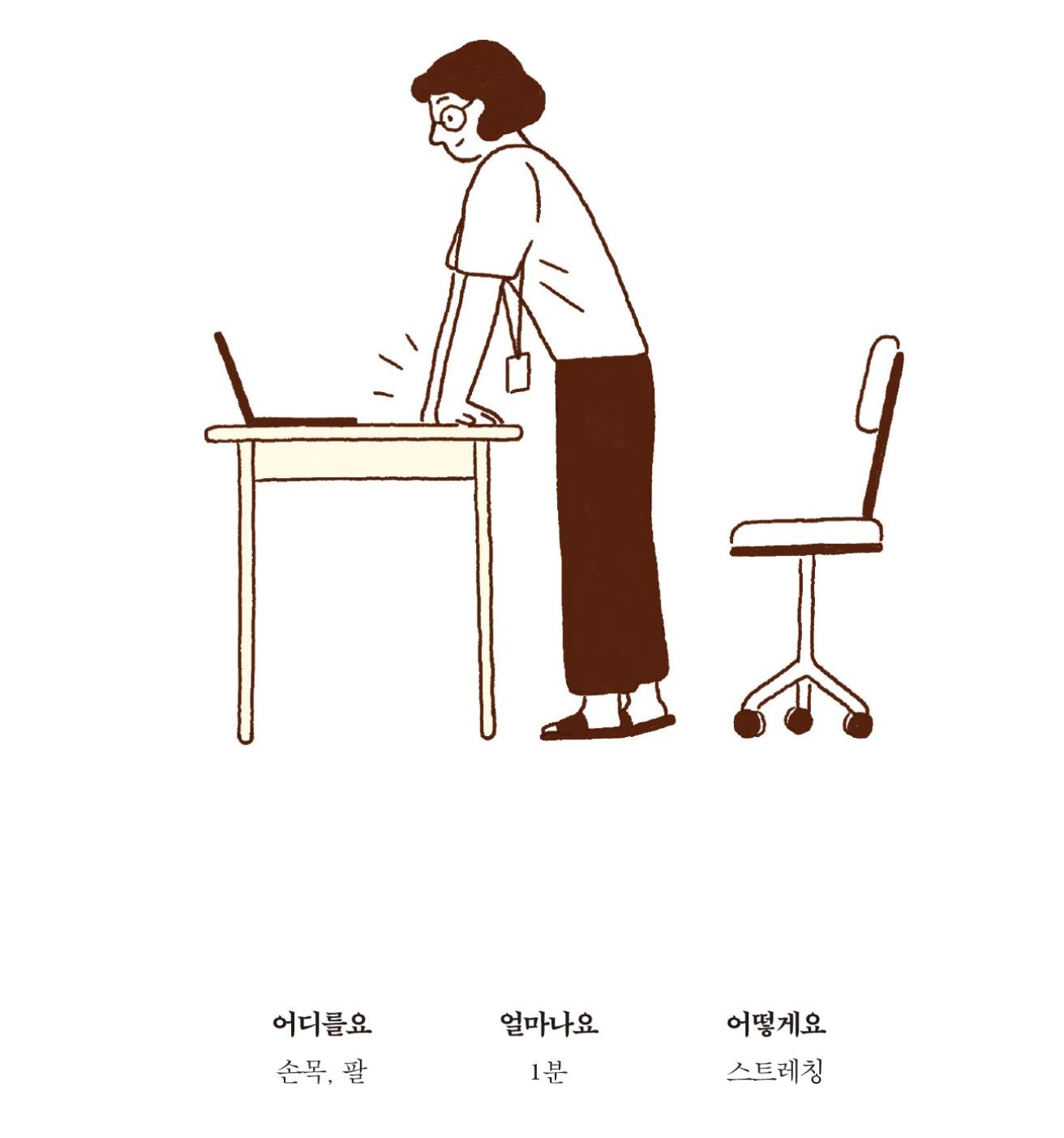 자리에서 일어나 책상에 손바닥을 붙인다. 손목을 반 바퀴 돌려 손가락이 몸 쪽을 향하게 한 후 손목을 누르면서 손목과 팔 안쪽이 시원하게 늘어지는 것을 느껴보자. 키보드와 마우스 위에서 굳었던 손과 팔의 근육을 이완시켜 손목 터널 증후군을 예방할 수 있다. 앉은 자세에서 손바닥을 허벅지 위에 올려도 무방하다.