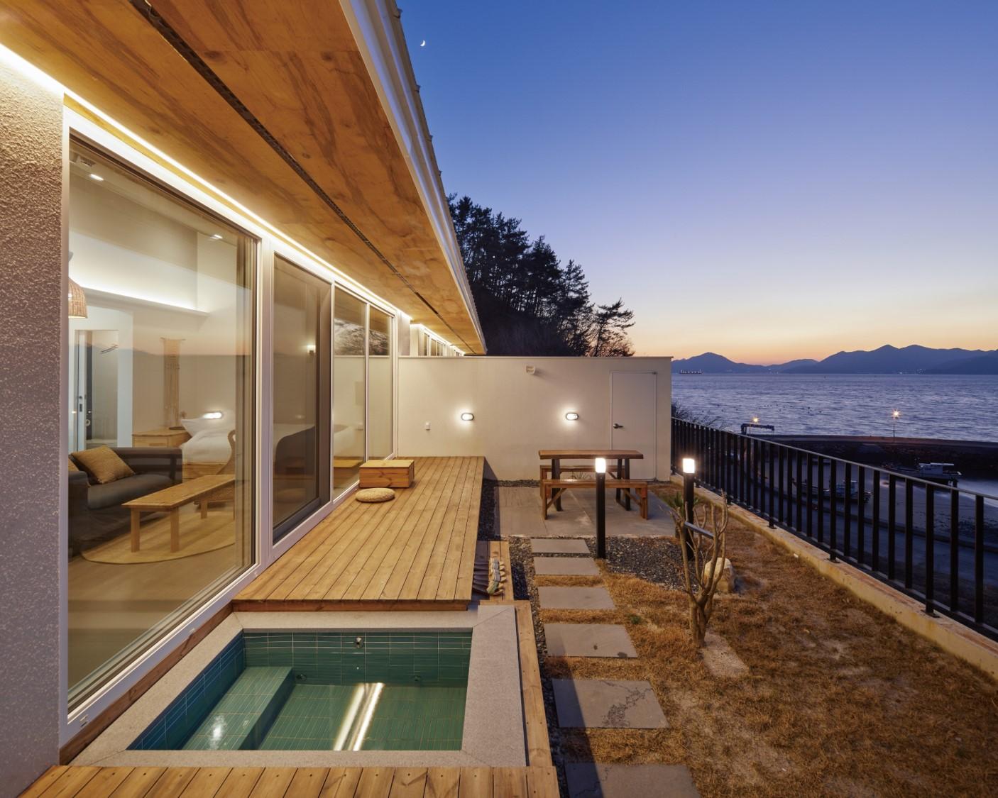데크 하나까지도 모든 마감재를 자연 그대로의 소재를 썼다. 더불어 삼각형의 수영장 끝에 석양과 함께 인생샷을 찍기 좋은 포토존이 인기를 끌고, 노천탕은 온도 제어 시스템을 적용해 늘 ‘적정 온도’를 유지한다.