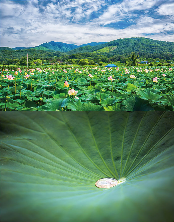 너른 이파리가 푸릇푸릇하게 마을 한복판을 메우고 있는 모습. 그 위로 빼꼼 고개를 내민 고운 빛깔의 연꽃, 옅은 분홍의 꽃잎이 수줍게 벌어진 모습은 아름답다고 하기 보다는 사랑스럽다는 말이 더 잘 어울린다.