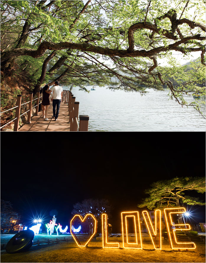 낮에는 한가로이 둘레길을 걷는 사람들과 수면 위를 떠다니는 오리배를 볼 수 있다면 밤에는 어둠이 내려앉은 호수 위로 별처럼 반짝이는 조명들이 빛을 낸다. 야간에도 산정호수를 즐길 수 있도록 포천시에서 ‘산정호수 별빛여행’이란 테마로 야간경관 조명을 설치한 것. 사방에서 반짝이는 빛들의 향연에, 늦은 밤 찾은 산정호수가 더욱 아름답다.