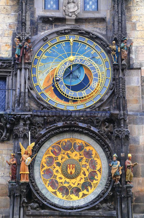 특히 이곳 외벽에 설치된 천문시계를 보기 위해 언제나 여행객들로 북적인다. 매시 정각이 되면 천문시계의 작은 창이 열리면서 목각으로 만든 조각상들이 나와 춤을 춘다.