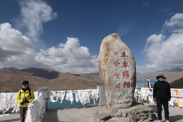 해발 4,998m 표지석 앞은 인증 사진을 찍으려는 관광객들로 짧은 줄이 만들어져 있다. 표지석 뒤 난간엔 오색의 타르초와 흰색의 ‘하다(하얀 천)’가 촘촘히 걸려 있고, 그 뒤로는 연둣빛 호수 얌드록쵸가 웅장하게 모습을 드러낸다.