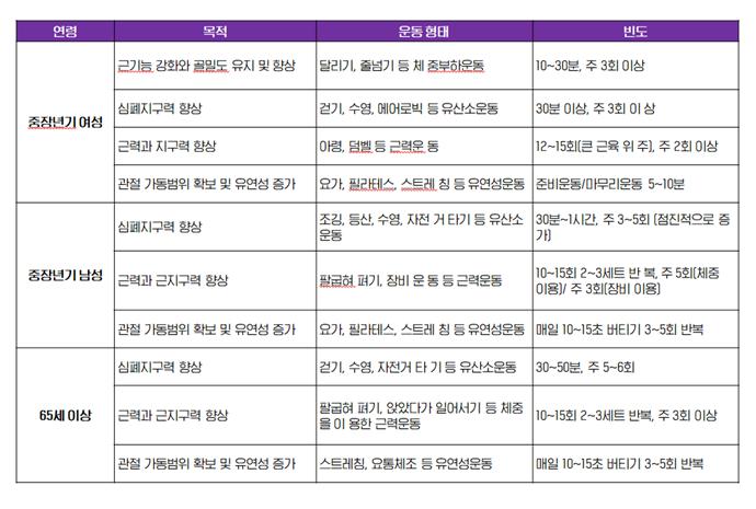 무거운 중량을 들어 올리는 웨이트 트레이닝을 추천한다. 부위별로 단련할 근육을 정해 주 1회 정도 근력운동을 하되 한 달에 1∼4㎏씩 늘린다는 생각으로 꾸준히 한다. 허리와 복부 운동에도 신경 써야 한다. 마지막으로 삼성서울병원 스포츠의학팀에서 추천하는 연령별 운동이다. 건강한 노년을 위해서는 유산소운동, 근력운동은 필수다.