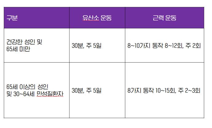 운동 강도가 정해졌다면 운동은 얼마나 해야 할까? ACSM(미국 스포츠의학회)과 AHA(미국심장학회)에서 추천하는 성인 대상 최소 운동 시간은 다음과 같다.