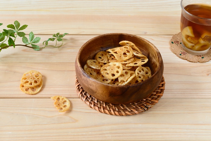 위를 보호하고 소화를 돕는 뮤신이 풍부해 천연 소화제라 불리는 연근. 조림과 볶음은 염도가 높지만 연근칩은 튀기지 않아 가볍게 즐기기 좋다. 그대로 말린 연근칩은 영양소 파괴가 거의 없어 연근을 먹은 것과 같은 효능을 볼 수 있다.