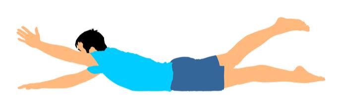 1 엎드려서 양팔과 다리를 올리면서 머리와 가슴도 올릴 수 있을 만큼 들어올린다. 위로 올린다는느낌보다 손끝과 발끝을 몸으로부터 멀리 떨어뜨린다는 느낌으로 뻗는다.