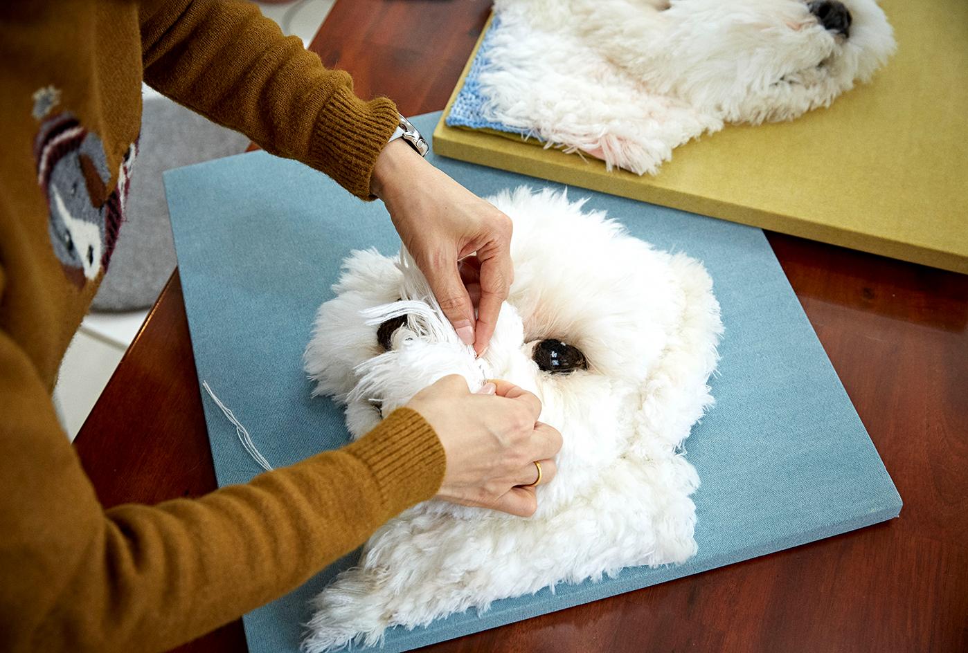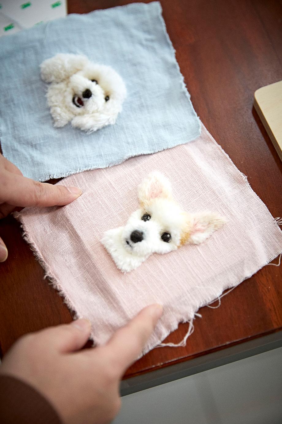 정해진 이미지를 기법을 통해 표현하는 것이 일반적인 자수라면 펫자수는 기법이 1이라면 9가 작가의 감정이 이입되어야 완성됩니다. 기법으로 특별한 부분을 꼽자면 눈을 작업하는 것이 중요해요. 여타 인형처럼 인공 눈을 붙이는 것이 아니라 실로 한땀한땀 눈동자를 그대로 표현해 더 살아있는 것처럼 보이죠.