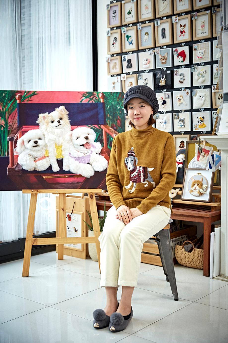 전공은 보디페인팅, 메이크업 특수분장 쪽이었어요. 자수도 실을 통해 색을 쓴다는 점에서 전공과 일맥상통한다고 생각해요. 자수를 취미로 배우고 사업으로 키운지만 21년 차에요. 펫자수를 전문적으로 다룬 건 9년 째고요. 반려동물을 키우고 있었기 때문에 접근이 쉬웠던 이유가 가장 컸고, 10여 년 전 향후 미래 트렌드를 보는데 펫 업종이 성장할 것이라고 하더군요. 이 분야를 파면 승산이 있을 거 같았어요. 실제로 꾸준히 수요가 늘고 있습니다.