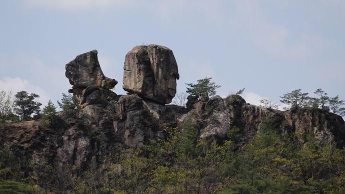 배바위, 장군바위, 투구바위, 해골바위, 송이바위 등 다 내가 등산 하면서 붙인 이름이다. 송이바위를 지나 가파른 암능을 따라 숨을 몰아 쉬면 800m 능선에 올라 설 수 있다. 70년 초까지 참숯을 구웠던 장소다. 당시 생계수단으로 참나무로 숯을 만들어 장날에 내다 팔았다. 여기서 청풍호가 아름답게 보인다. 이제부터는 완만한 능선을 따라 소나무 군락지를 지나 동산(895m) 정상에 향한다. 이 정상은 나무로 둘러 싸여 조망이 없다.