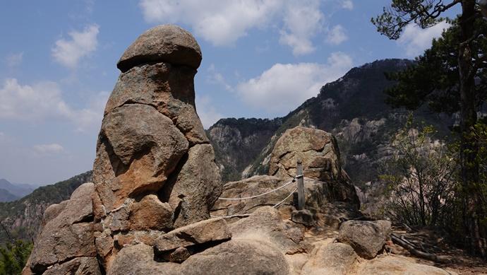 이번 산행은 남근석이 있는 암능을 따라 올라갔다. 예전에는 남근석을 송이같이 생겨서 송이바위라 불렀었다. 70년 초에는 릿지로 힘들게 다녔지만 지금은 계단식 데크에 로프까지 안전하게 설치해 놓았다. 절에서 30분 정도 가파른 길을 올라오면 있다. 여기서 북쪽을 바라보면 암능 릿지가 해골 형상 같아 우리는 해골바위라 부른다. 이 암능도 여러 코스가 있어 재미 있는 곳이다.