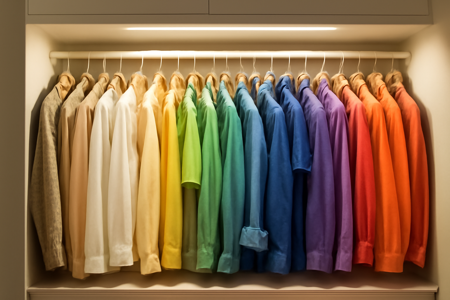 옷장이나 책장을 색깔별로 정리하면 시각적으로 매우 만족스럽습니다.