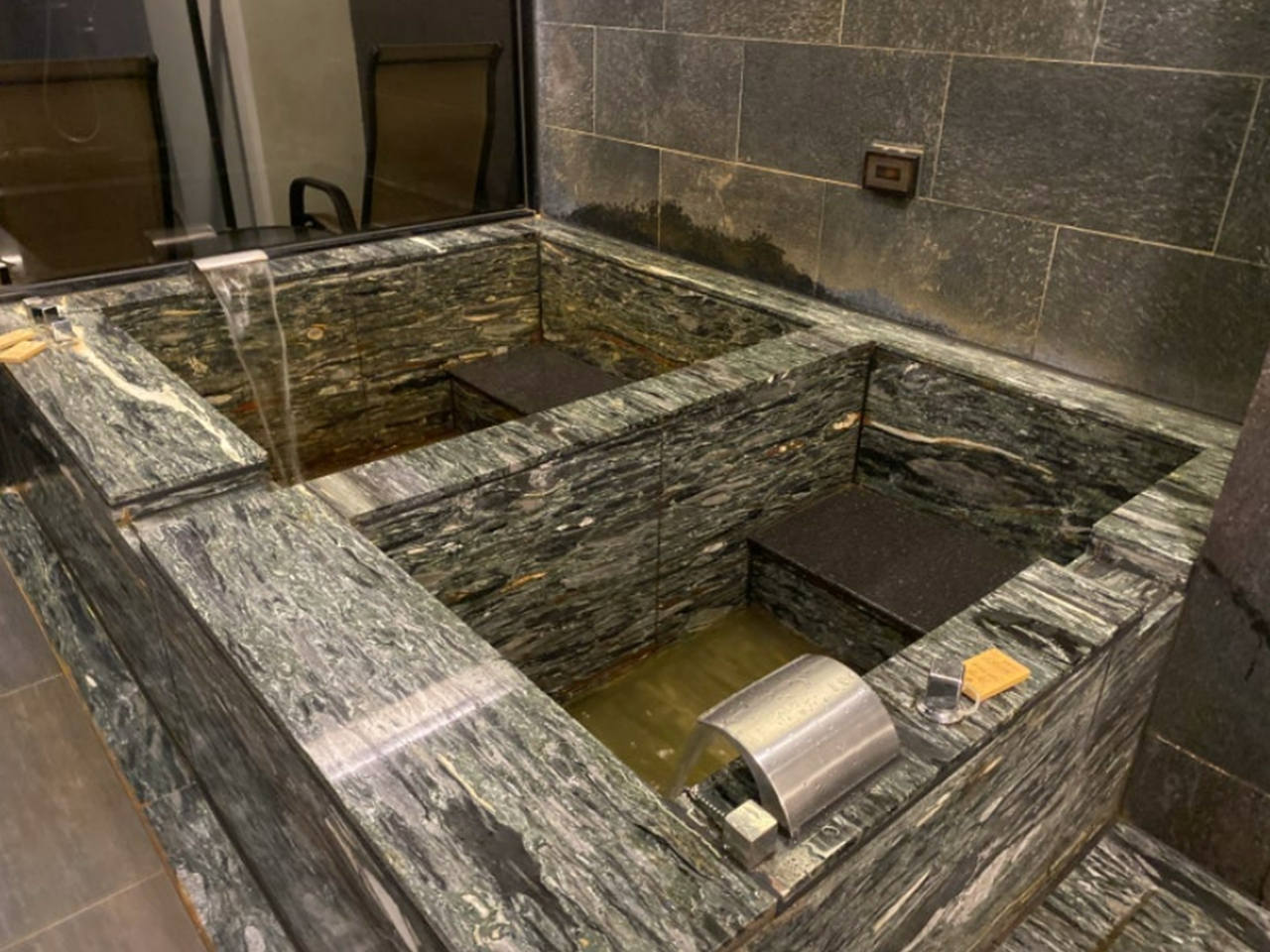 대리석 자쿠지가 두 개가 있고 한쪽에서는 온천을