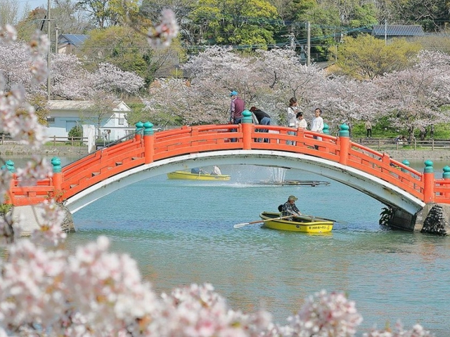 봄이 되면, 공원 안 커다란 연못 위 놓인 붉은 다리와 연못을 따라 만개한 벚꽃이 어우러져 환상적인 풍경이 펼쳐진다.