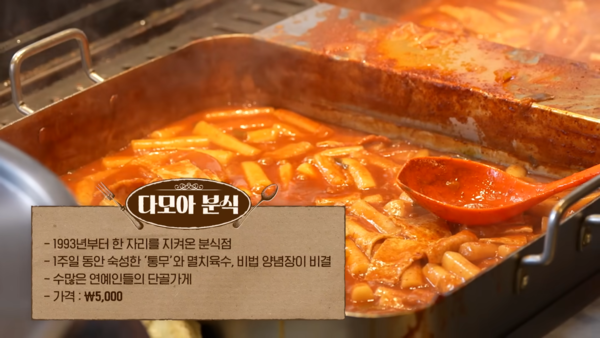 한가인이 제일 먼저 향한 곳은 ‘다모아분식’. 그녀는 이전에 광고를 촬영할 때 스탭들 중 한 명이 포장해 온 것을 먹어보고 푹 빠져 단골이 되었다고 밝혔다. 그녀의 딸 역시도 여기를 좋아한다. “학교를 조퇴하고 같이 가고 싶다”고 말할 정도로 열의를 드러냈다는 후문.