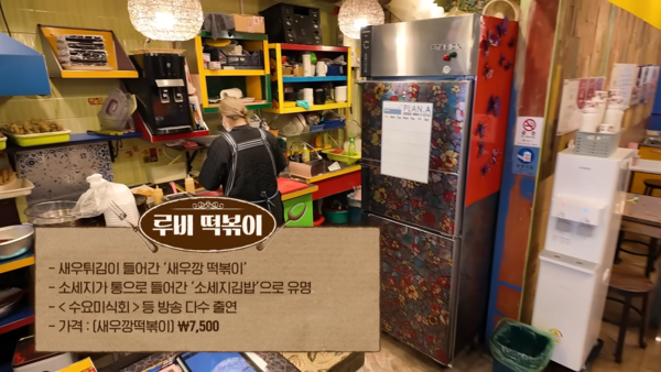 한가인은 두 번째로 ‘루비 떡볶이’로 향했다. 대표 메뉴는 새우깡떡볶이와 소세지김밥. 새우깡떡볶이란 흔히 반찬용으로 쓰이는 작은 새우를 튀겨서 토핑으로 얹은 떡볶이. 해물의 풍부한 맛과 떡볶이의 양념이 잘 어우러져 독특하면서도 계속 찾게 된다는 것. 소세지김밥은 소세지를 통째로 넣은 김밥이다. 느끼하지 않도록 와사비와 마요네즈 소스 등을 버무려 맛의 균형을 맞추었다.