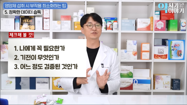 부작용 없이 영양제 섭취하는 법을 설명하고 있는 고약사 /유튜브 채널 '약사가 들려주는 약 이야기' 캡처 |