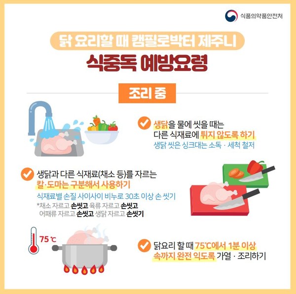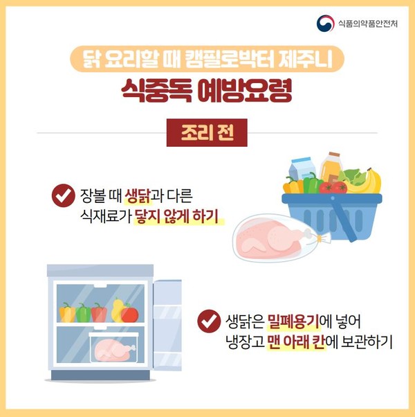 특히 생닭의 캠필로박터균은 여름철 식중독을 일으키는 주 원인이며, 닭고기를 씻는 과정에서 다른 식재료에 튀면 식중독을 유발할 가능성이 크다.