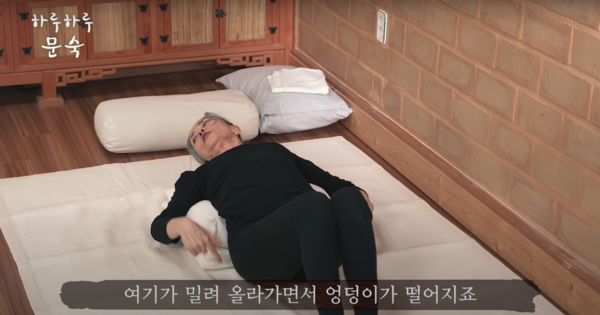 집에 있는 베개나 방석을 허리에 바짝 받치고 누우면 엉덩이가 살짝 바닥에서 떨어지게 된다.