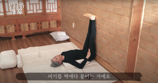 벽에서 한 뼘 정도 거리를 두고 벽에 다리 전체를 맞댄다는 느낌으로 두 다리를 세운 채로 눕는다.