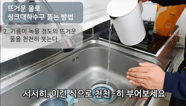기름은 ‘뜨거운 물’에 가장 잘 녹는다. 즉 기름은 열에서 가장 빠르게 녹는다. 유튜브 채널 <하수구의 제왕>이 소개한 싱크대 기름 녹이는 법은 다음과 같다.