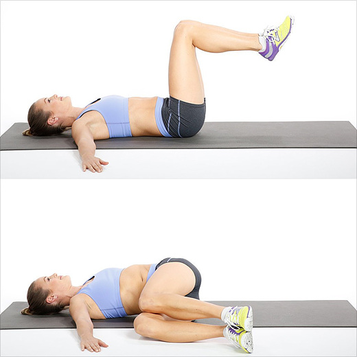 복근 강화 운동이다. 천장을 바라보고 누워서 복근의 힘으로 다리를 올렸다 내렸다 반복한다. 허리가 뜨지 않도록 해야 복근에 힘을 바로 줄 수 있다. 유연성이 부족하다면 무릎을 구부리고 해도 된다. 다만, 발이 몸에서 멀어질수록 복근을 더 많이 사용할 수 있다.
