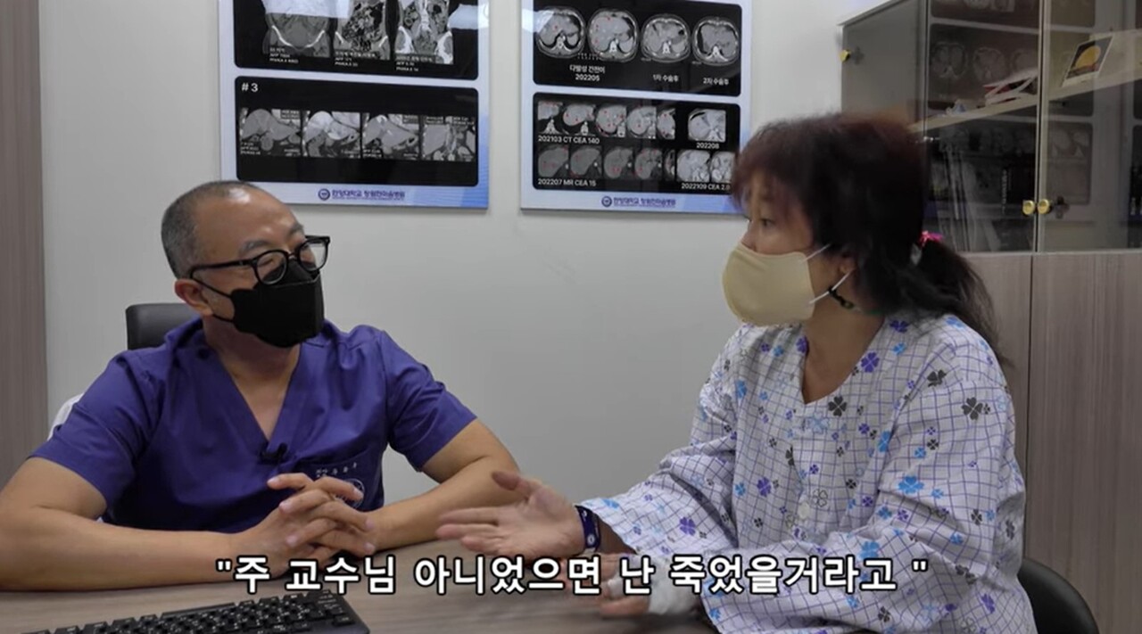 그러면서 "예전 병원에서는 '한 2년 살겠네요' 그러더라"면서 "나중에야 간으로 전이된 병변이 17개인 걸 알았다. 결국 항암을 40번이나 했다"라며 뒤늦게 담당의가 바뀌면서 유명을 달리할 수 있었던 기적 같은 순간에 대해 고백했다. 담당의는 "맞다. 제가 살려드린 거다"라며 너스레를 떨면서도 "전이된 암은 열심히 찾아야 된다. 눈에 보이는 것만 제거하면 안 된다"라며 아찔했던 순간에 대해 비판을 하기도 했다.