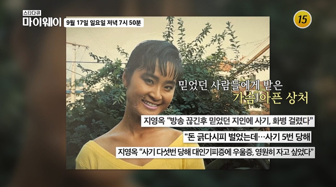 쓰리랑 부부로 유명했던 개그우먼 지영옥이 돈 때문에 여러 번 사기당한 뒤 우울증과 대인기피증에 시달렸던 과거에 대해 입을 열었다.
