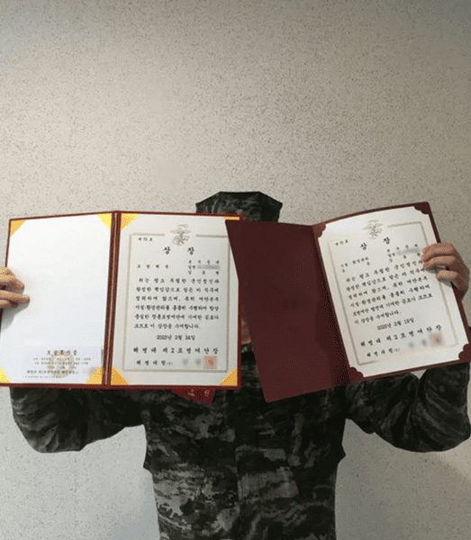 상장에는 '평소 투철한 군인정신과 왕성한 책임감으로 맡은 바 직무에 정려하여 왔으며, 특히 여단본부 시설·환경 관리를 훌륭히 수행하며 항성 충실한 청룡포병여단에 기여한 공로가 크므로 이 상장을 수여합니다'라고 적혀있었다.