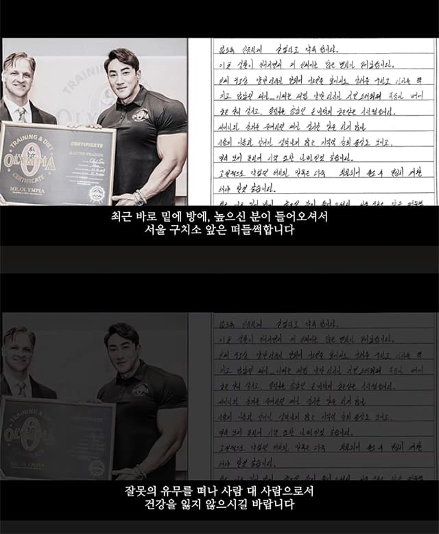 이어 "장시간 말을 하지 않아 사람의 이름과 단어가 생각나지 않는 기억력 감퇴 증상도 보인다. 멀리 보지 못하여 시력 또한 나빠진 것 같다. 고질적으로 약했던 허리와 발목은 더욱 퇴화되어 출소 후 열심히 재활해야 할 것 같다”고 털어놨다.