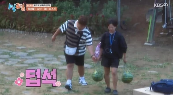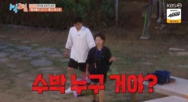 첫 번째 테스트 대상자인 김종민은 양손에 수박을 들고 있는 막내 작가를 보며 "누구 거냐"라고 물어보면서도, 들어주지 않았다.