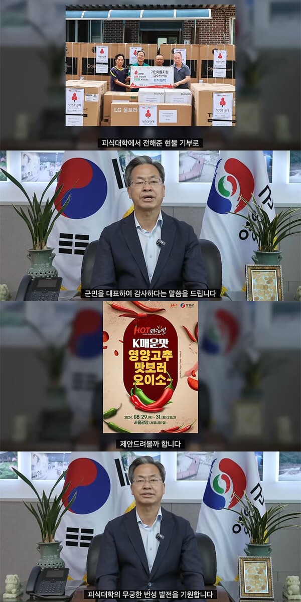영상에는 오도창 영양군수가 등장했다. 오도창 영양군수는 "얼마 전 우리 지역 수해 발생 시 피식대학에서 전해준 현물 기부로 많은 도움을 받았다. 군민을 대표하여 감사하다는 말씀을 드린다"라며 피식대학의 미담을 전했다.