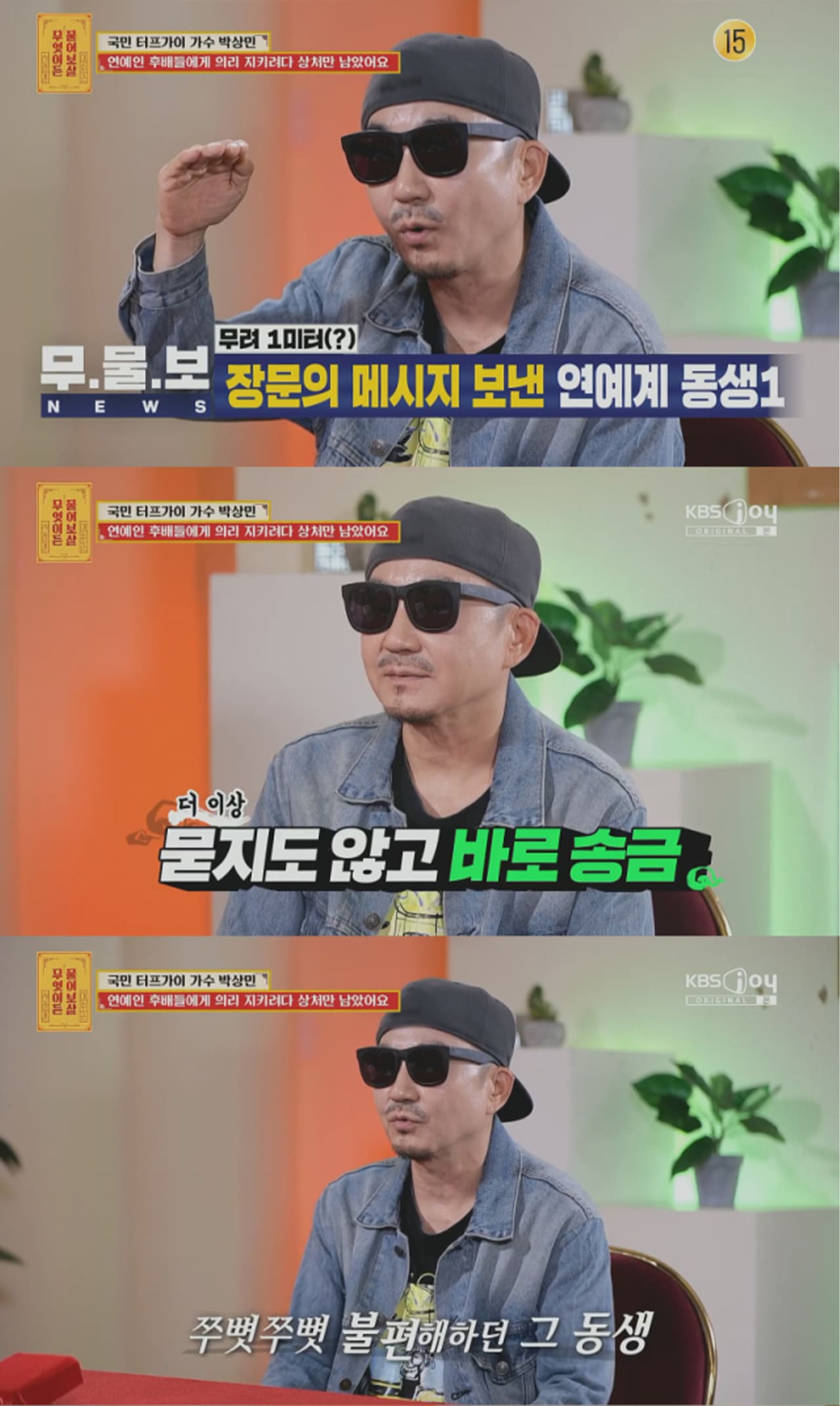 이날 박상민은 후배 연예인들에게 상처를 많이 받았다고 털어놨다. 그는 "의리 챙기다가 사람과 돈을 모두 잃는 게 고민"이라며 "한쪽에서만 (일방적으로) 마음이 나가는 건 의리가 아닌 것 같다"고 했다.
