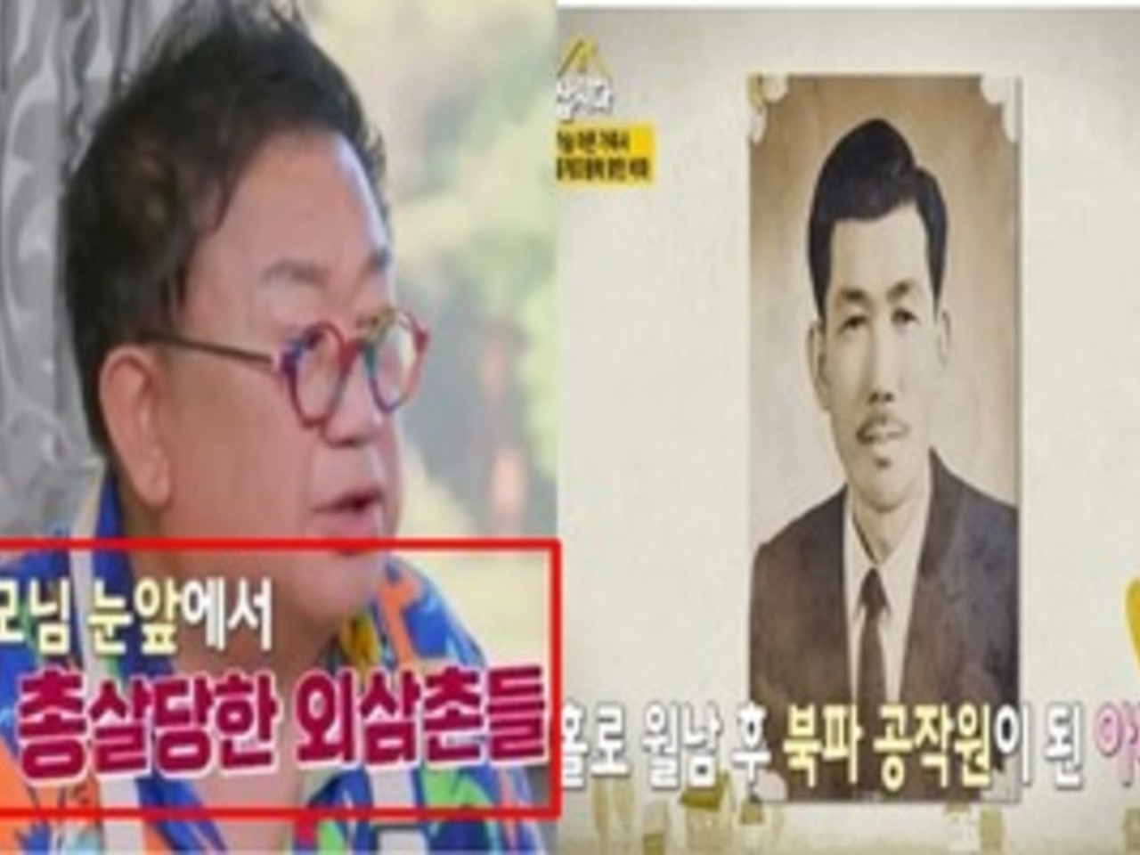 그러면서 "그런데 누가 신고를 해서 우리 외삼촌 둘이 잡혔다. 외삼촌들이 동네 공터에 묶여서 부모님 눈앞에서 인민군한테 총살당했다. 숨어있었단 이유로 총으로 사형시켰다"라고 전해 모두에게 충격을 가했다.