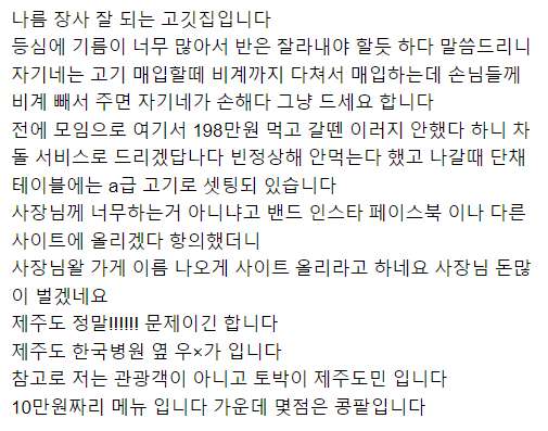 A씨는 태도에 "사장님, 너무하신다. SNS나 커뮤니티에 다 올리겠다"고 경고했으며, 사장은 오히려 "가게 이름 나오게 올려라"라고 응수했다고 한다. 이에 A씨는 "제주도 정말!!!!문제이긴 합니다. 제주도 한국병원 옆 XXX입니다. 10만원짜리 메뉴 입니다. 참고로 저는 관광객이 아니고 토박이 제주도민입니다." 라고 글을 작성했다.