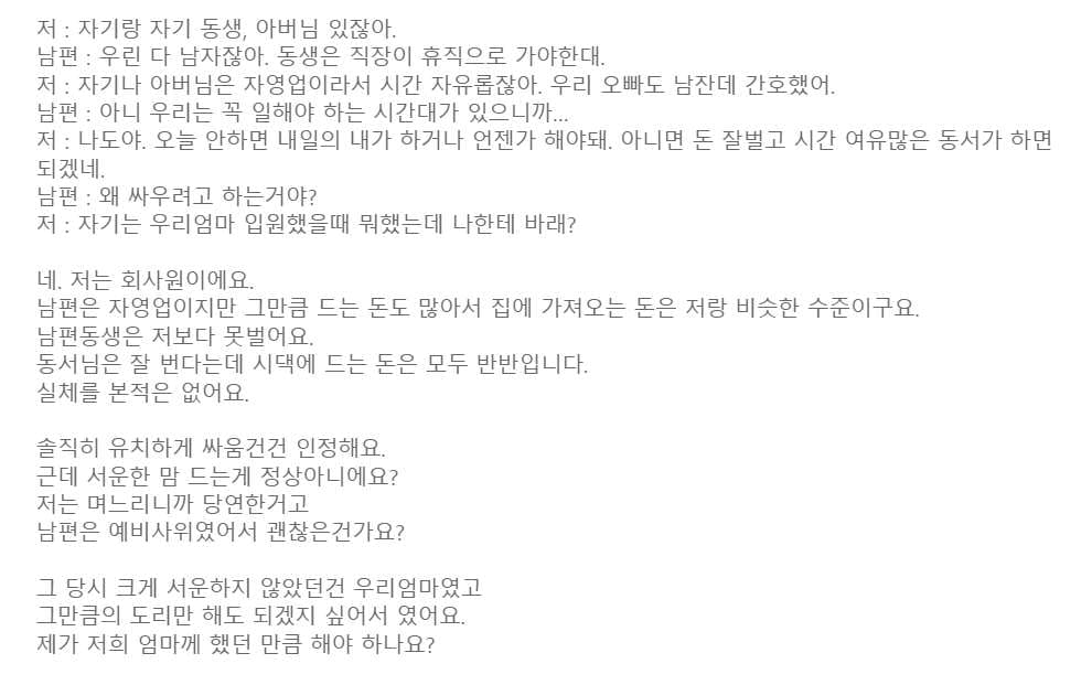 이어 남편은 A씨가 자신의 모친이 병상에 있었을 때 본인이 집안일을 도맡아 했던 사실을 언급하면서, 자신도 같은 상황에서 같은 배려를 해야 하는지에 대해 의문을 제기했다.
