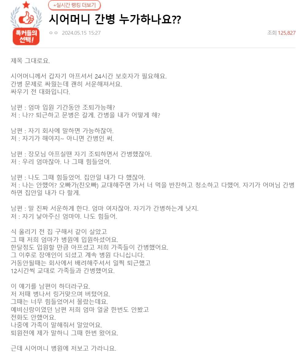 사연의 글쓴이인 A씨는 직장인으로 바쁜 일상을 보내고 있으며, 시어머니가 요양이 필요한 상황에서 남편으로부터 간병을 요청받았다. 남편은 자영업자로 조금 더 유연한 근무가 가능함에도 불구하고, 어머니가 글쓴이와 같은 여성이라 간병을 하는게 낫지 않냐며 설명했다.